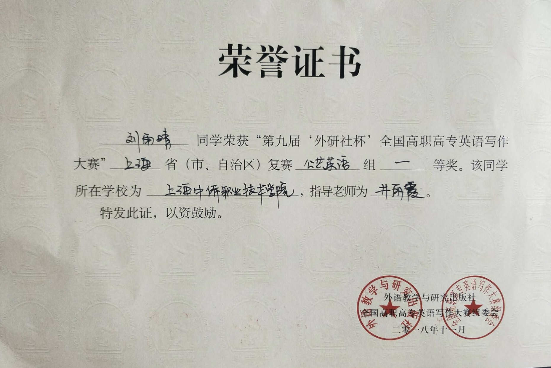 18年底,由教育部职业院校外语类专业教学指导委员会、外语教学与研究出版社共同举办的“第九届‘外研社杯’全国高职高专英语写作大赛”上海复赛在上海工艺美术职业学院徐家汇校区顺利举行。在井丽霞老师的指导下,我院17级报关与国际货运专业刘雨晴同学凭借个人的良好素养、扎实的专业功底,从比赛中脱颖而出,荣获公共英语组一等奖的优异成绩。
