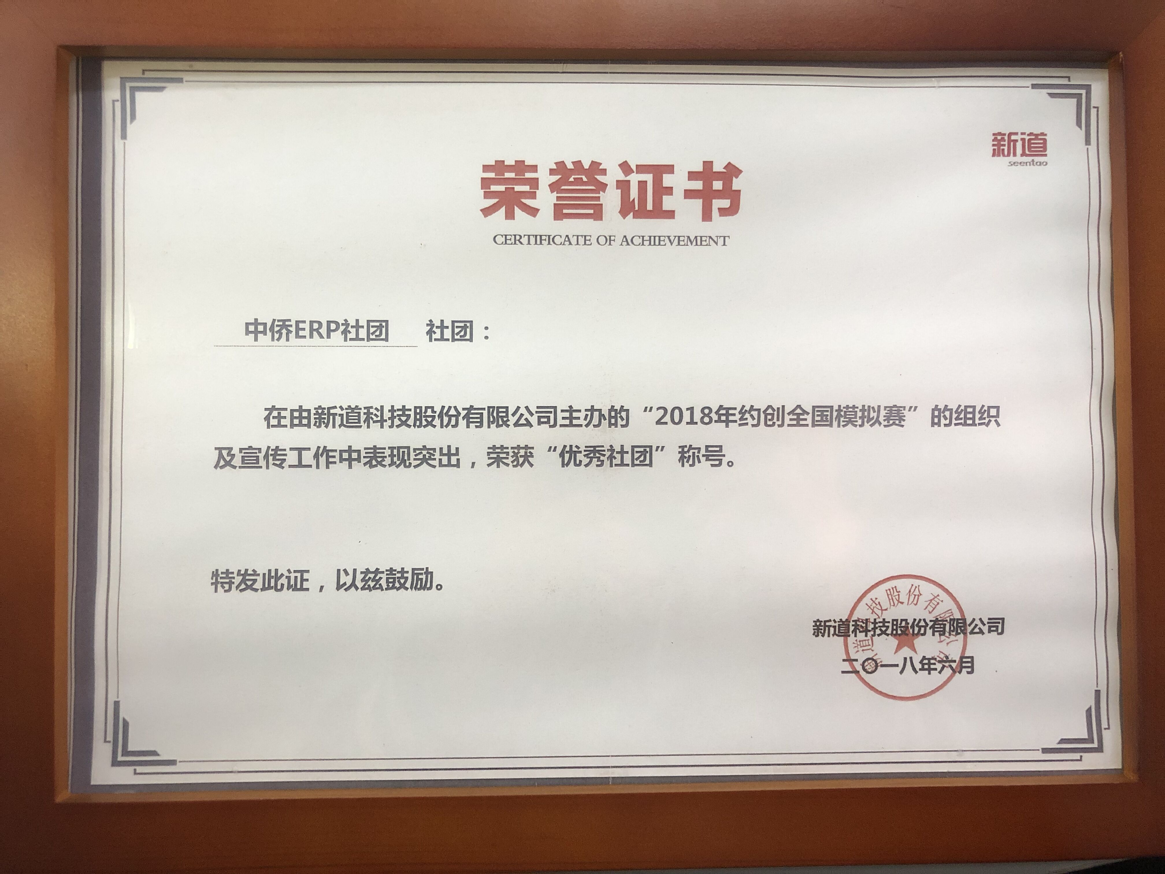2018年5月,由新道科技股份有限公司举办的“2018年约创全国模拟赛”在上海中侨职业技术学院五号楼举行。在张倩倩老师的指导下,我院17级工商企业管理专业丁贤刚、陈云飞、邱鑫、叶利聪、肖佳亮、肖亮亮,六位同学凭借个人的良好素养、扎实的专业知识,从比赛中脱颖而出,荣获约创全国模拟赛表现突出奖,以上同学所在中侨ERP社团荣获“优秀社团”称号。