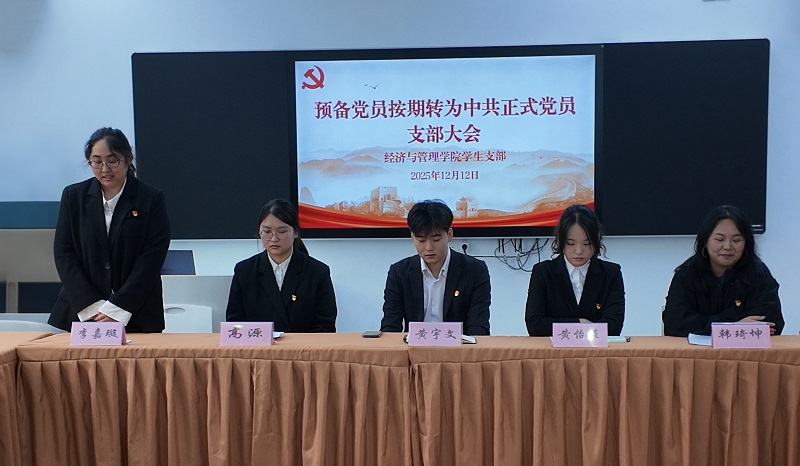 2025年12月12日,经济与管理学院学生支部在3号楼402召开预备党员转正大会。会议由支部书记韩伟佳主持,支部应到党员44人,实到44人,其中有表决权党员23名,符合《中国共产党发展党员工作细则》规定,程序合法有效。大会核心议题为讨论接收李嘉璇、高源、黄宇文、黄怡菲、韩琦坤5名同志为中共正式党员。