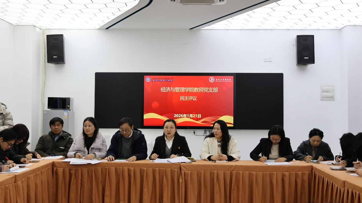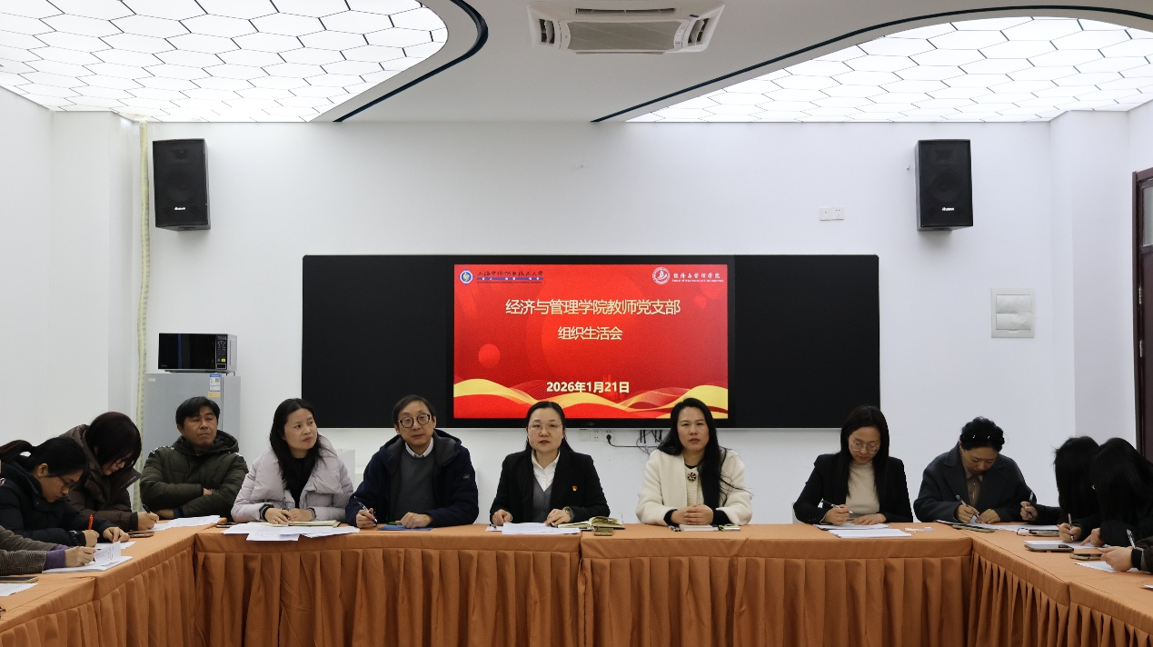 为深入学习贯彻党的二十届四中全会精神,巩固党纪学习教育成果,2026年1月21日,经济与管理学院教师党支部在3号楼402会议室召开专题组织生活会暨民主评议党员大会。分管校长戴红梅、学院院长张炳达列席会议,会议由经管学院党总支书记(兼教师支部书记)杨慧同志主持,全体教师党员参加。
