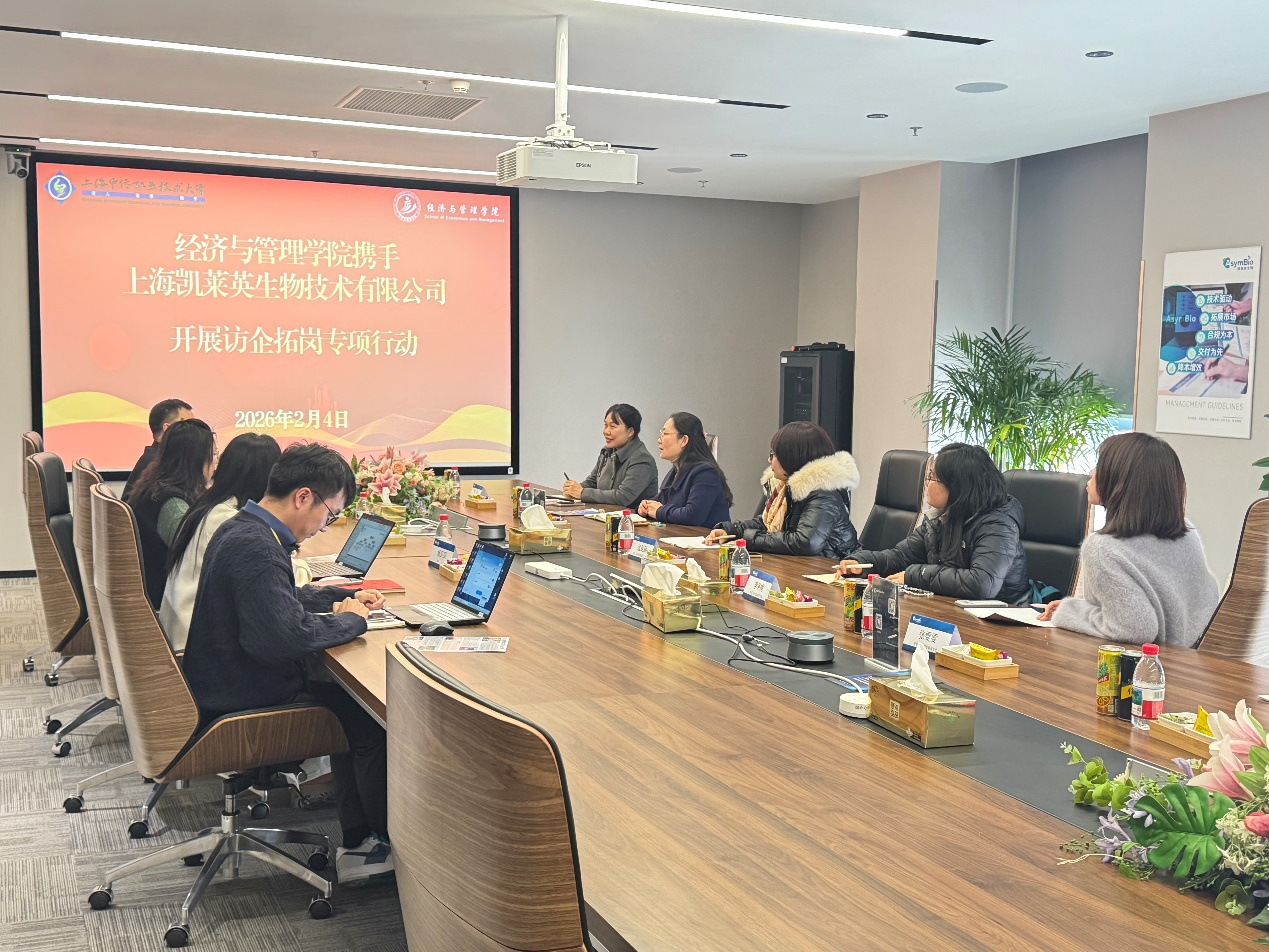 为深化产教融合、校地协同,精准对接生物医药等区域新兴支柱产业人才需求,推动毕业生高质量就业,2026年2月4日,经济与管理学院党总支书记杨慧带队赴上海凯莱英生物技术有限公司(以下简称“凯莱英生物”)开展访企拓岗专项行动。学院现代物流管理专业主任远亚丽、产教融合负责人范徽,专任教师李冬梅、张雯雯,以及“管培生计划”优秀学生代表钟嘉颖共同参与。本次行动旨在总结前期合作成效,实地调研实习生工作情况,并围绕产教融合深化与协同育人机制创新开展深入研讨。