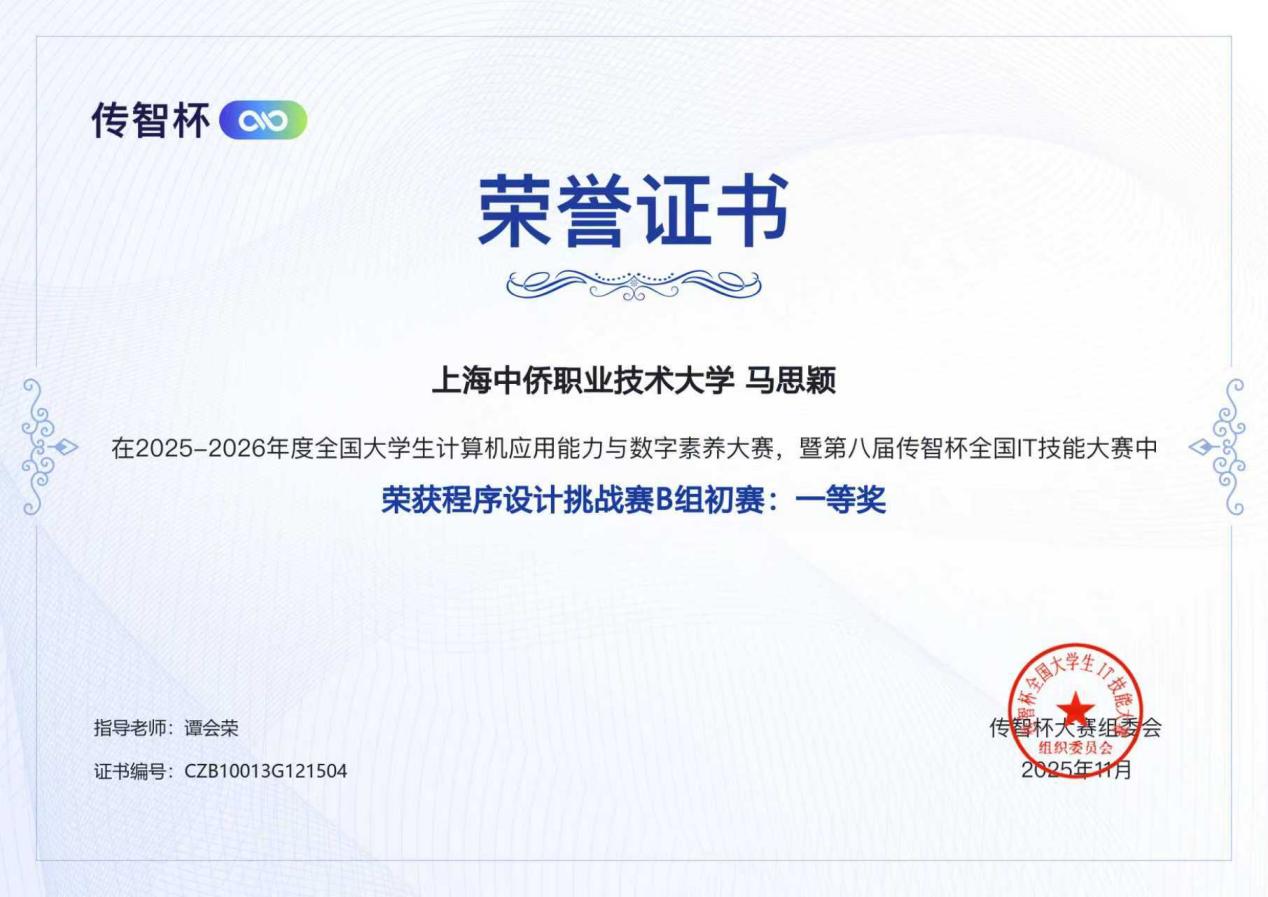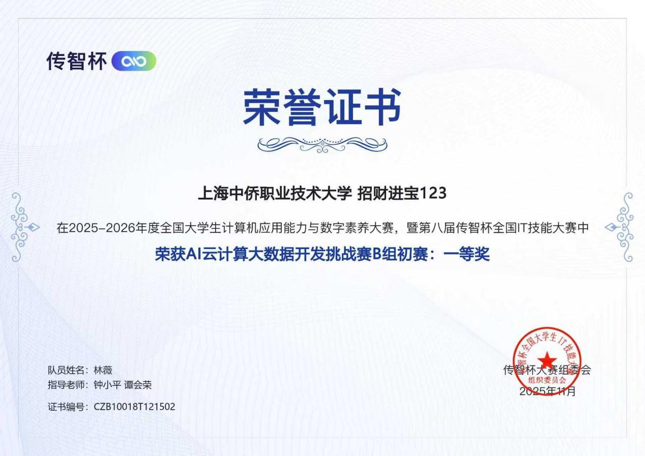 2025年传智杯全国IT技能大赛于12月27日举行。在经济与管理学院金融服务与管理专业主任钟小平老师的带领下,在谭会荣、李冬梅等老师指导下,我院“招财进宝”团队凭扎实专业功底,斩获AI鸿蒙原生应用创新赛项团队初赛二等奖,展现我院学子专业素养与竞技能力,为学院争得荣誉。团队成员为马思颖、林薇、陈钰三位同学。三人同获程序设计挑战赛个人赛初赛一等奖,林薇还斩获AI云计算大数据开发挑战赛个人赛初赛一等奖。(供稿:林薇)