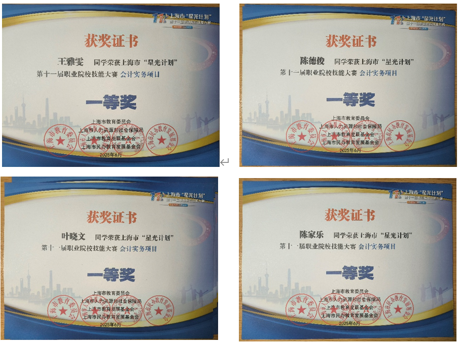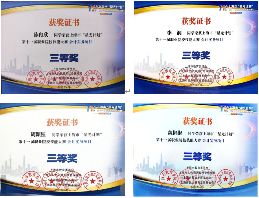 上海市“星光计划”第十一届职业院校技能大赛于2025年5月29日举行。在大数据与会计专业的秦静、周星等教师的指导下,经过长时间激烈的角逐,来自经济与管理学院大数据与会计专业的陈德俊、陈家乐、王雅雯、叶晓文4位同学获得一等奖,陈冉欣、李润、周颖钰、魏彬彬4位同学获得三等奖。(供稿人:周星)