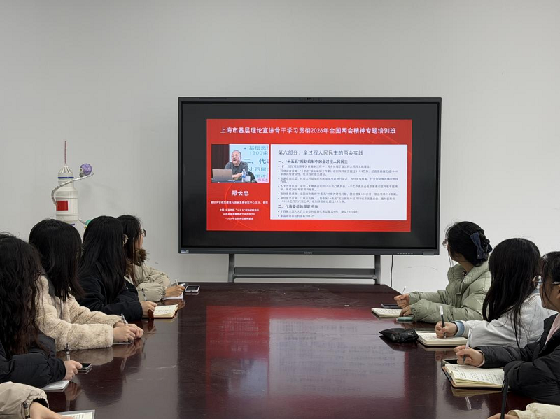为深入学习贯彻2026年全国两会精神,切实把师生党员的思想和行动统一到党中央决策部署上来,2026年3月19日,经济与管理学院学生支部以线上线下相结合的形式组织全体师生党员开展专题培训,在3号教学楼307会议室集中观看上海市基层理论宣讲骨干学习贯彻2026年全国两会精神专题培训班课程,推动两会精神入脑入心、落地生根。