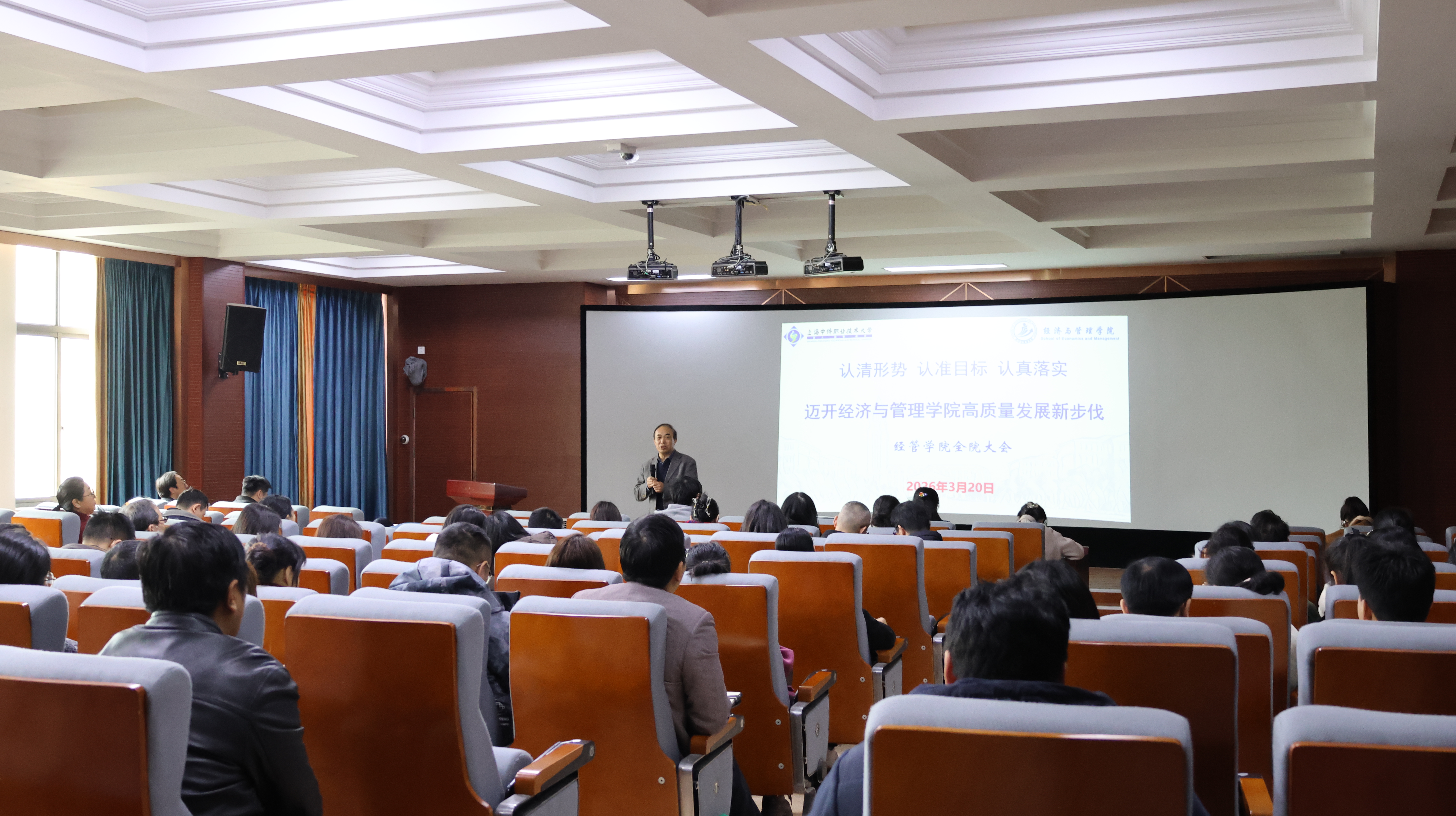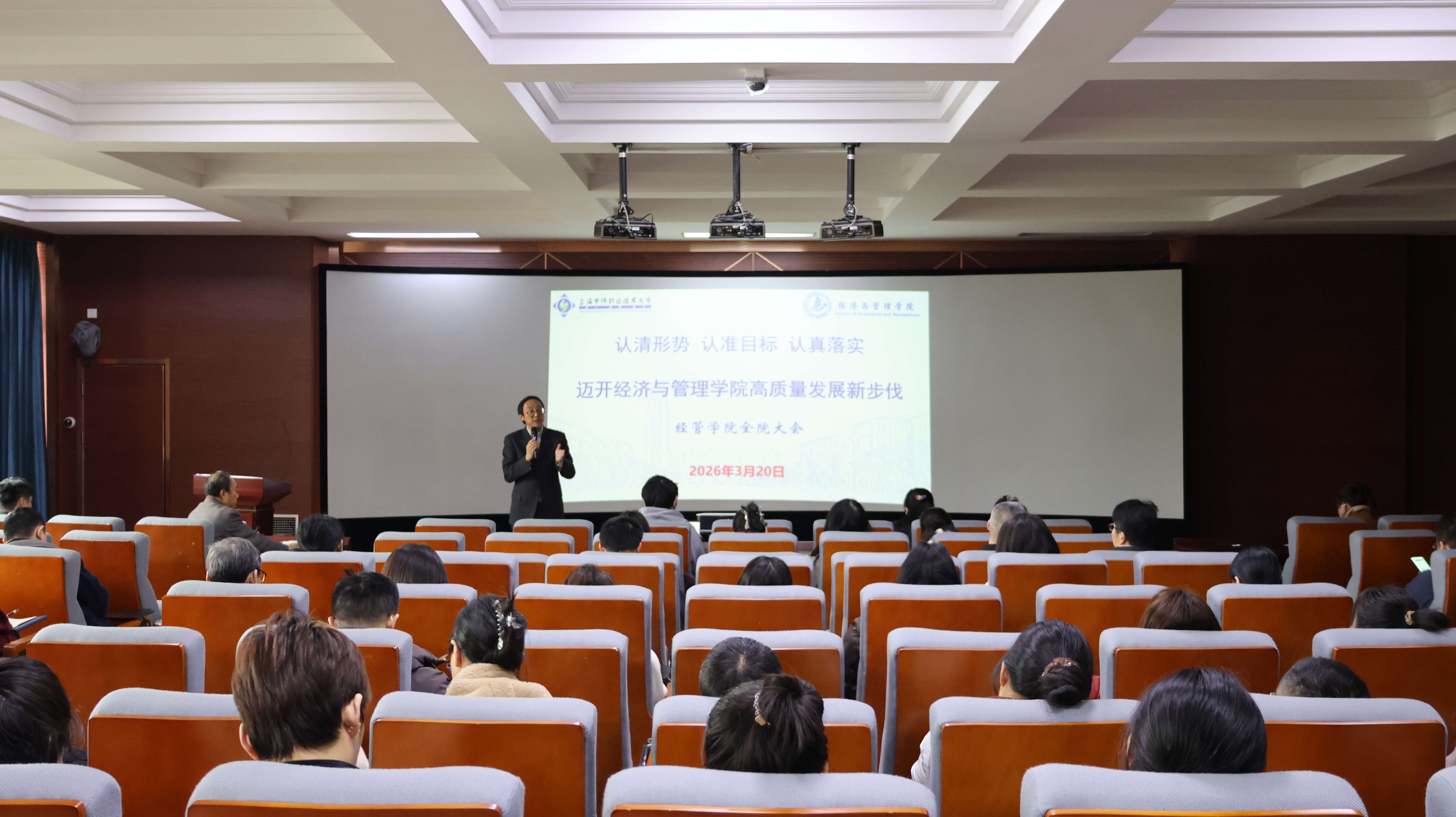 会上,张炳达院长以“认清形势、认准目标、认真落实,迈开经济与管理学院高质量发展新步伐”为主题发表讲话。他从学校发展大局出发,深入分析了当前学院面临的新形势与新机遇,系统阐述了学院在未来发展中的定位与方向。张院长指出,当前学院正处在高质量发展的关键阶段,全体教师要进一步统一思想、提高认识,紧紧抓住职业教育改革发展的有利契机,在专业建设、师资队伍优化、产教融合等方面持续发力。他强调,面对新形势下的机遇与挑战,全院上下要树立大局意识,强化责任担当,以更高的标准、更实的举措推动学院各项事业再上新台阶。张院长同时对全体教师提出殷切期望,希望大家立足岗位、锐意进取,在学院发展的快车道上实现个人成长与集体进步的共赢。