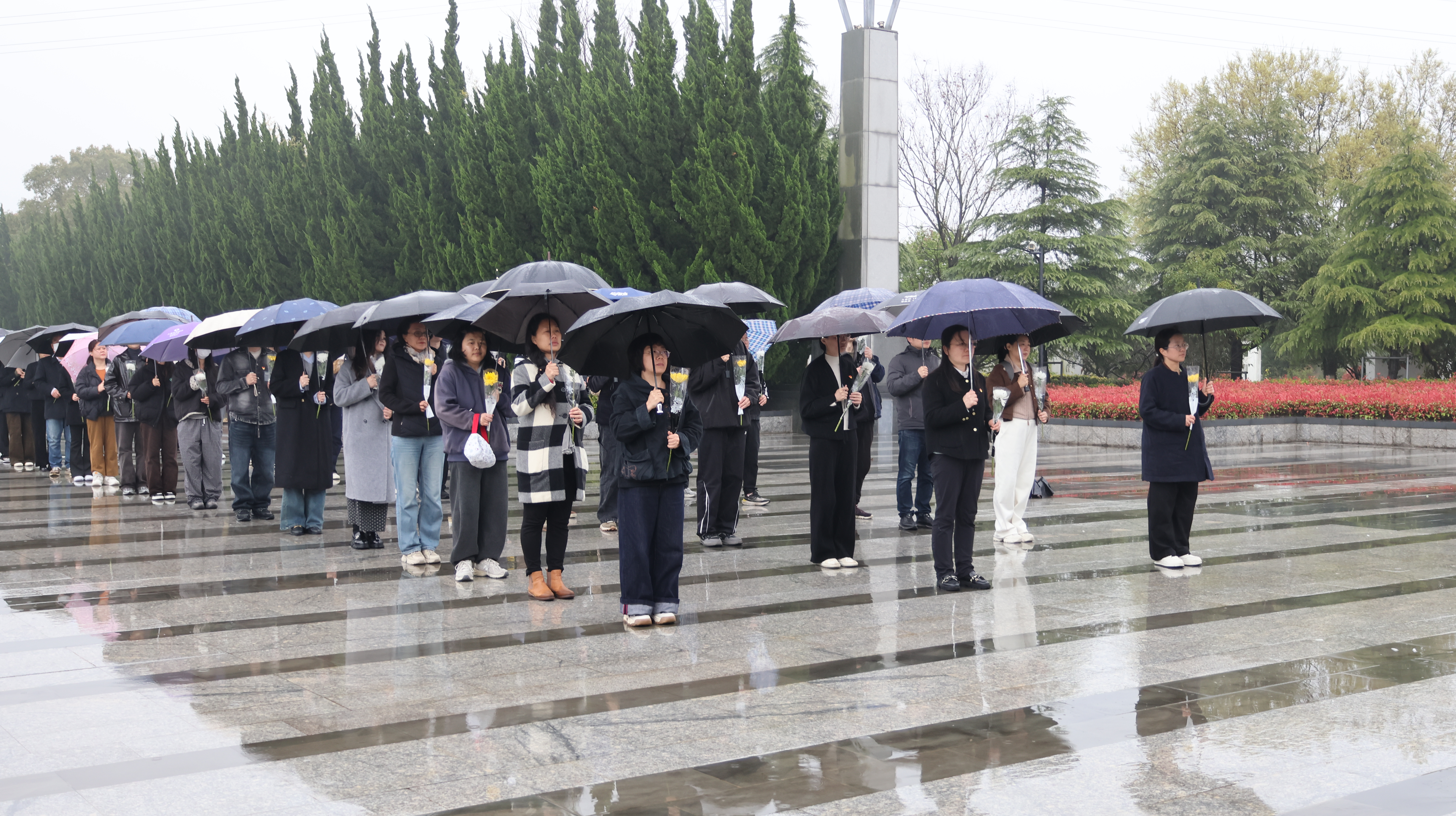 步入烈士陵园,庄严肃穆。全体师生党员整齐列队,在革命烈士纪念碑前庄严奏唱国歌并肃立默哀,鞠躬致敬,深切悼念英勇献身的革命先烈。随后,大家依次敬献鲜花,以最庄重的方式寄托哀思,告慰英烈忠魂。